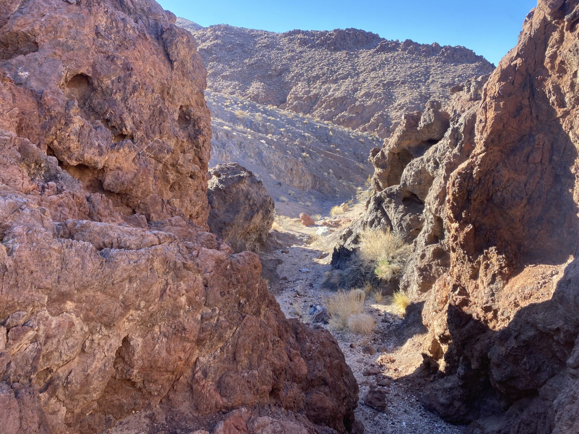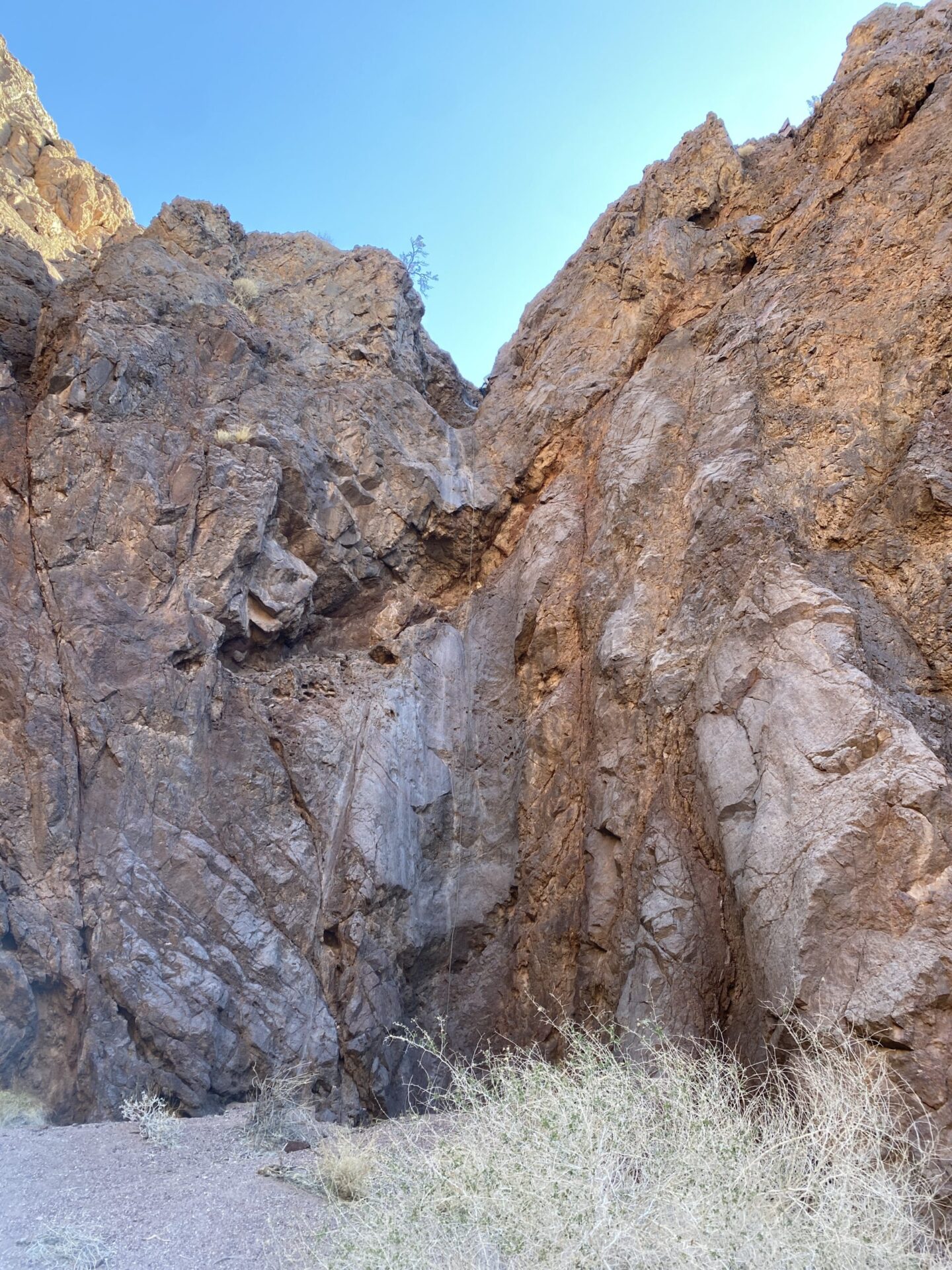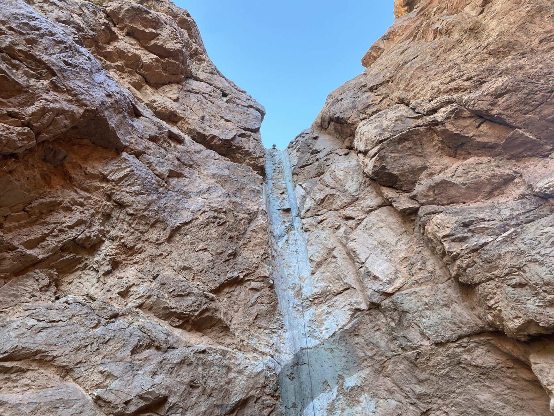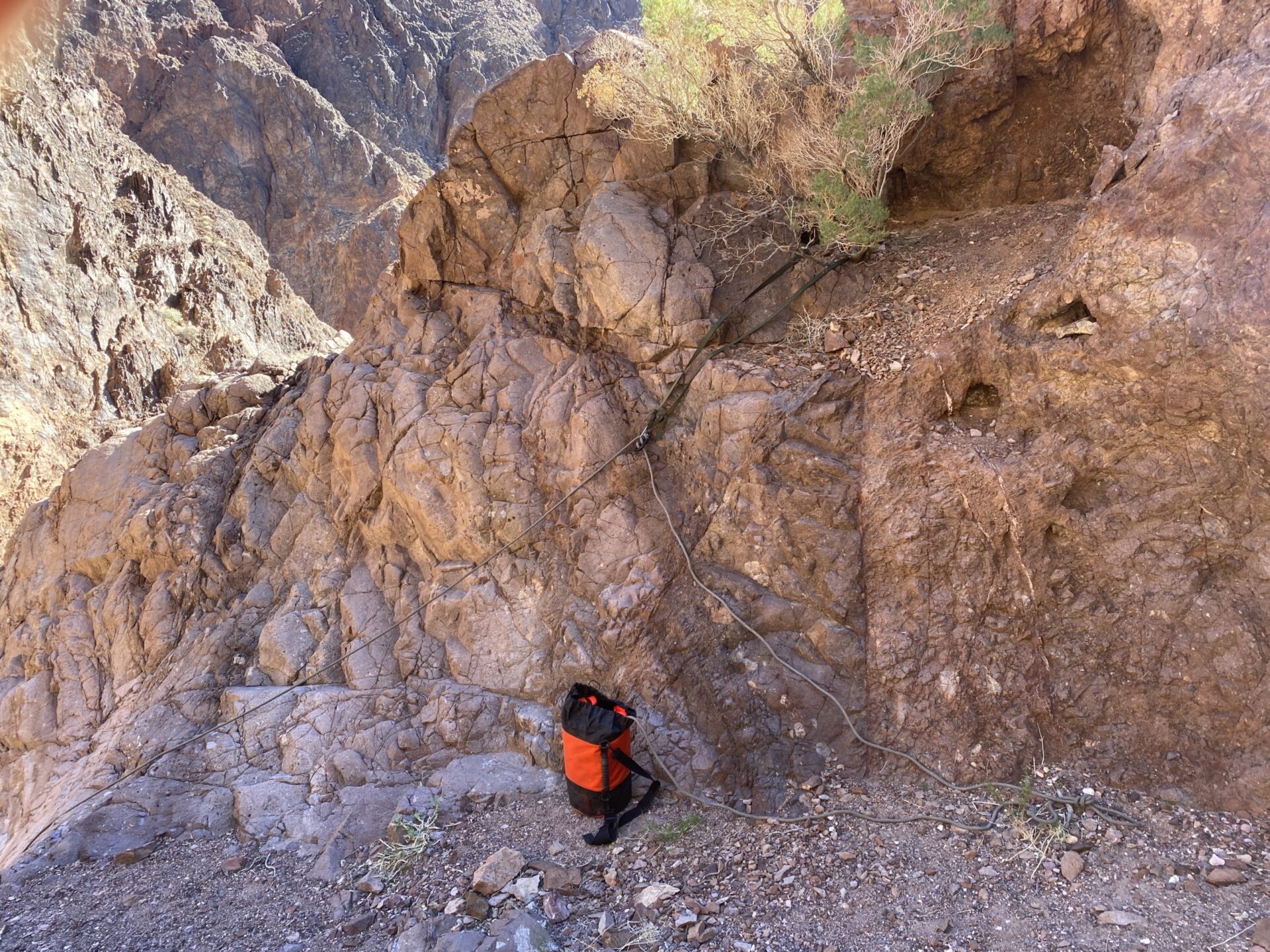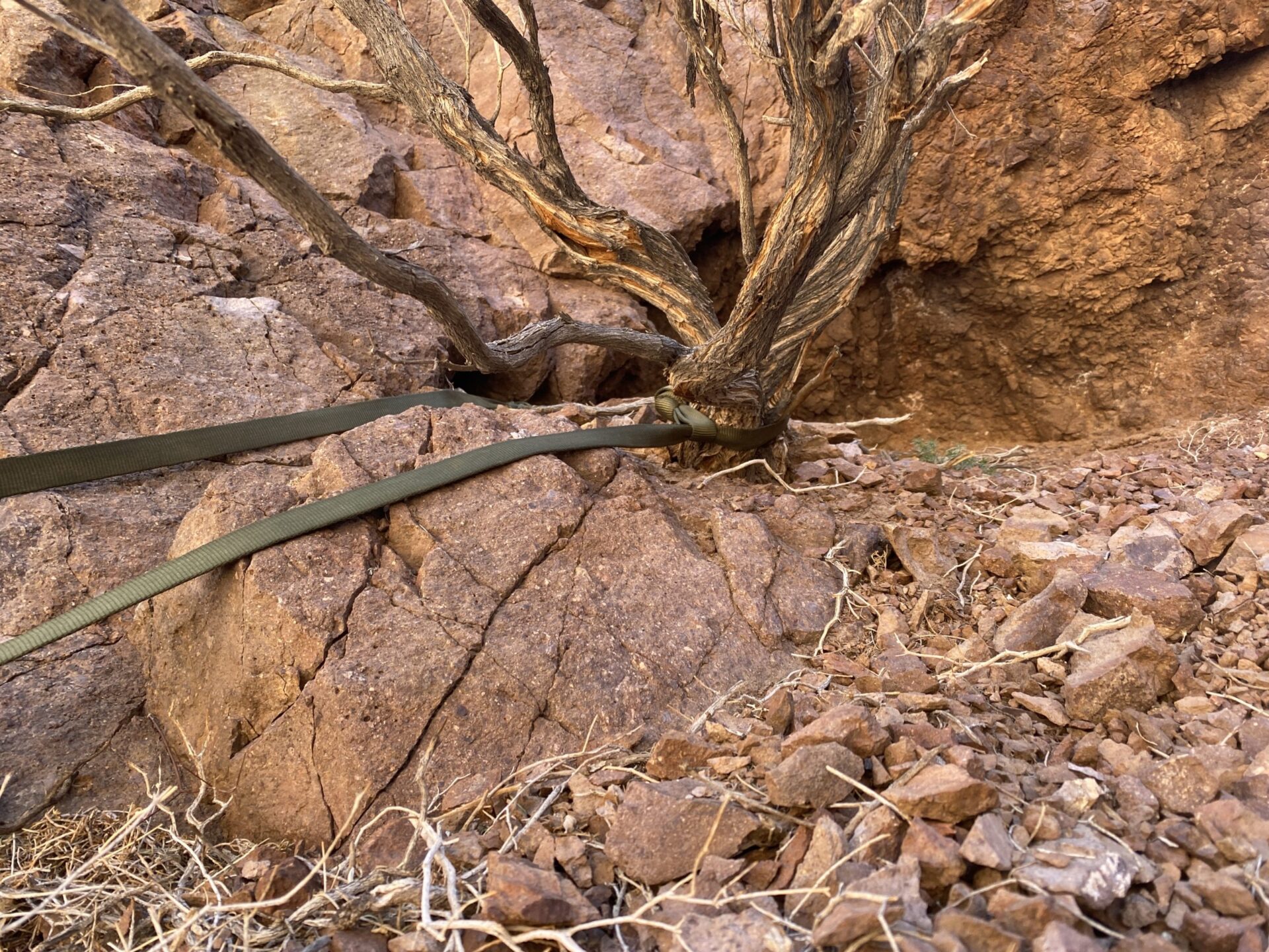 We walked a little from the first rappel and then hit the first technical section with several back to back rappels. The third rappel was the first bush/tree rappel I’ve done in Death Valley where shrubbery typically isn’t present in the canyon. Rappelling 220 lbs off a bush/tree the size of my wrist in a canyon of rock (where are those roots going?) was interesting, but hanging on the webbing around the organic anchor’s base showed almost no movement.